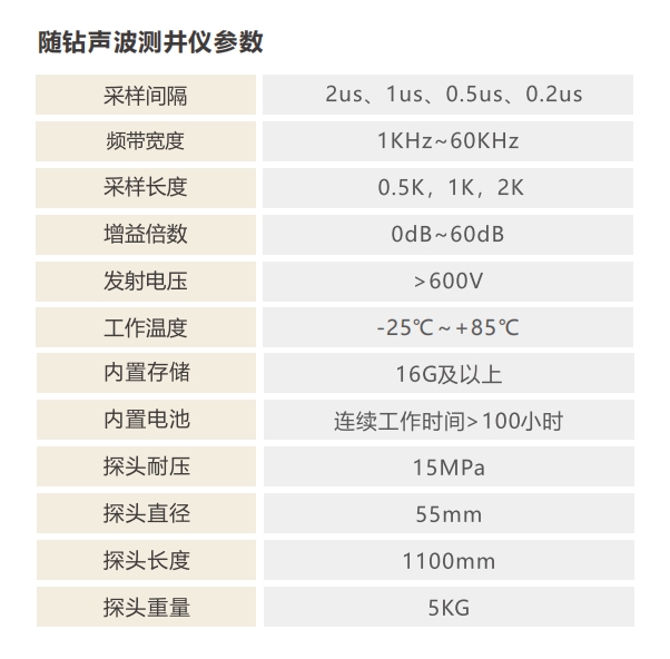 随钻声波设备系统主要由控制主机、计数装置(钻杆计数、线缆计数)、随钻声波探头组成,声波探头是集压电陶瓷换能器、发射电路、信号采集数字化、数据存储器、电源于一体,适用于垂直孔、水平孔、斜孔检测;测试过程控制主机与声波探头无需数据电缆连接,声波探头自采自存(盲采数据),声波探头连接钻杆,钻机推入钻孔检测,设备轻便,操作简单,且设备安全可靠。 支持超深垂直孔检测,采用轻便的线缆悬挂声波探头,通过全自动线缆计数装置下方即可进行检测,解决了远距离数据线缆传输问题。