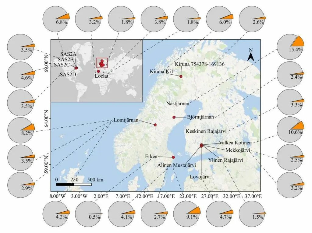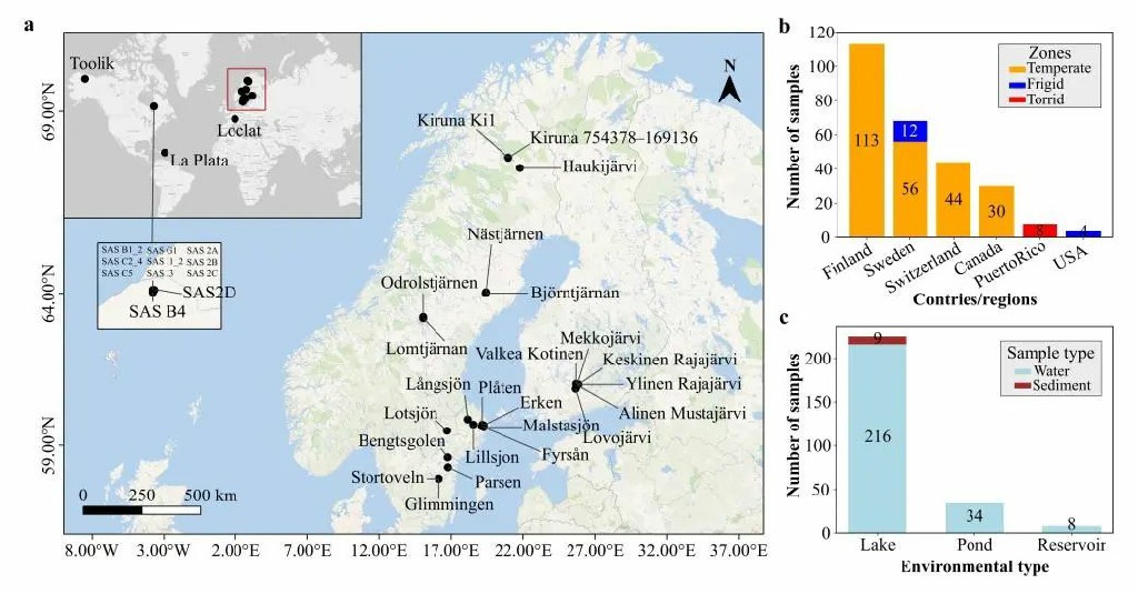 基于以上科学问题,中国科学院地质与地球物理研究所地球与行星物理学科中心地球与行星磁场及宜居性学科组的纪润佳博士后与林巍研究员、潘永信研究员等,对公开发表的来自北半球加拿大、芬兰、瑞士和瑞典等地的38个淡水湖泊、池塘和蓄水池的267个宏基因组数据进行了系统研究,分析了其中趋磁细菌的丰度、多样性和分布特征(图1)。这些样品覆盖水体的有氧-无氧过渡带,为深入认识淡水水体环境中的趋磁细菌提供了契机。