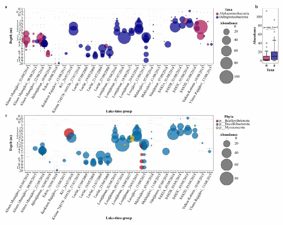 图3 趋磁细菌在湖泊和池塘氧分层水体中的分布与丰度特征。(a) 属于Alphaproteobacteria和Deltaproteobacteria的趋磁细菌基因组在26个湖泊-时间组中的分布和丰度情况;(b) 属于Alphaproteobacteria和Deltaproteobacteria的趋磁细菌基因组在26个湖泊-时间组中的丰度箱型图,基于非参数Mann-Whitney U检验表明Deltaproteobacteria趋磁细菌的丰度显著高于Alphaproteobacteria趋磁细菌;(c) 属于Deltaproteobacteria不同分类单元的趋磁细菌在26个湖泊-时间组中的分布与丰度