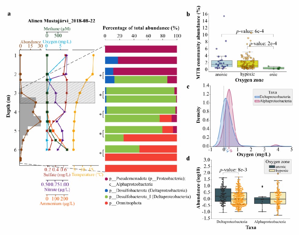 图4 淡水环境氧分层水体中趋磁细菌的垂直生态位分析。(a) 湖泊-时间组 Lake Alinen Mustajärvi_2018-08-22 的理化因子及趋磁细菌垂直分布特征;(b) 不同生态位样本中趋磁细菌的相对丰度;(c) Deltaproteobacteria和Alphaproteobacteria趋磁细菌的垂直生态位相对溶解氧浓度的分布统计图;(d) 低氧区和无氧区中Deltaproteobacteria和Alphaproteobacteria趋磁细菌的丰度统计