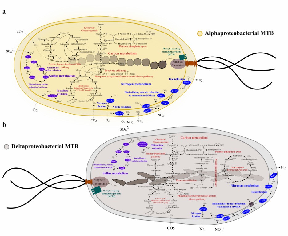 图5 Alphaproteobacteria (a) 和 Deltaproteobacteria (b) 趋磁细菌的代谢特征分析