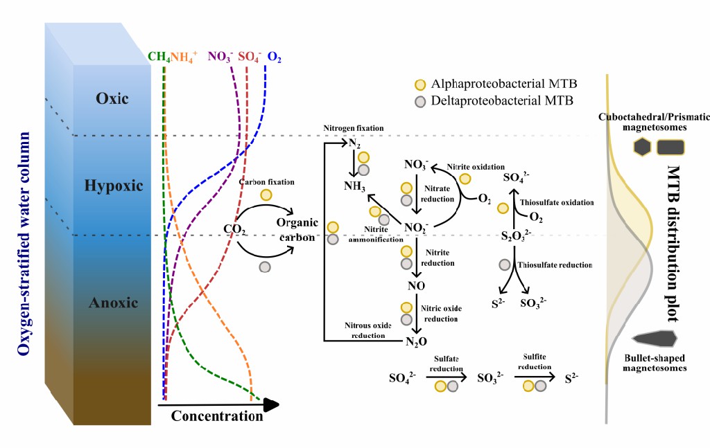 通过对北半球淡水环境氧分层水体中趋磁细菌的多样性、分布和丰度特征的系统分析,首次发现了属于Myxococcota门的趋磁细菌,揭示出Deltaproteobacteria趋磁细菌是淡水水体环境中的优势趋磁细菌类群,而非传统认识的Etaproteobacteria趋磁球菌。趋磁细菌具有垂直生态位分化的特征,氧浓度等理化因子在驱动趋磁细菌的分布和丰度中发挥了重要作用。该研究深化了对淡水环境趋磁细菌多样性和生态功能的认识,为利用化石磁小体重建古环境提供了新依据(图6)。