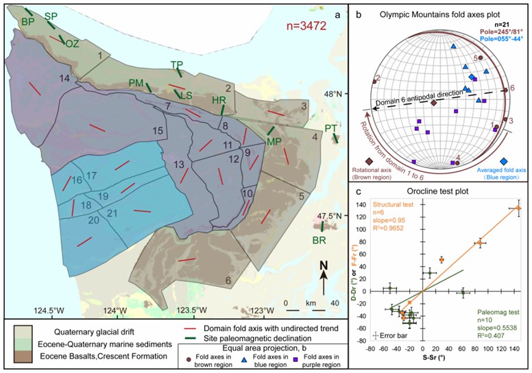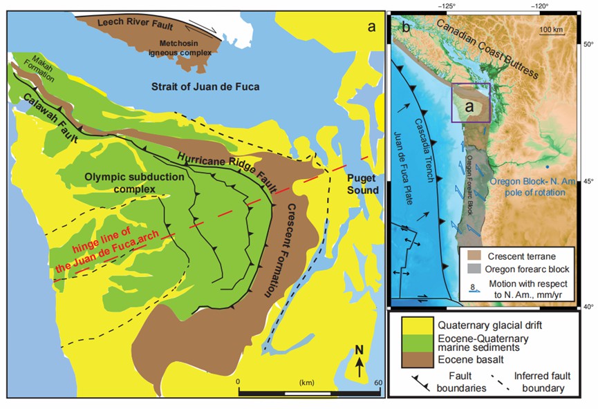 奥林匹克山脉的结构在俯视图中呈现出一种向陆地凸起的马蹄形(称为奥林匹克山弯构造),位于美国华盛顿州(图1)。奥林匹克山弯在区域构造中位于卡斯卡迪亚(Cascadia)俯冲带的上盘。GPS和古地磁研究表明,奥林匹克山弯的两翼在相对于北美克拉通的整体北向运动中记录了相反的旋转。这种弧形特征曾被解释为由于正向俯冲增生过程中的构造楔入体所导致的俯冲边界变形。然而,与其它地区不同的是奥林匹克山弯并未发现相应的构造楔入体,因此奥林匹克山脉为什么发生弯曲是学术界关心的问题。