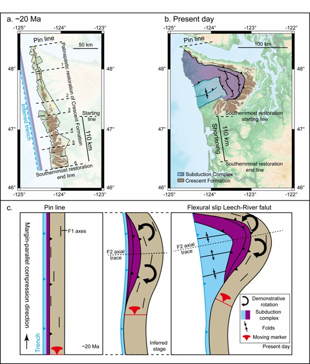 他们通过汇编和分析古地磁和构造数据(图2),揭示奥林匹克山脉展示出次生山弯构造特征,指示了平行于造山带的动力来源。利用古地理复原(图3),解构了这一水平褶曲,表明此山弯构造容纳了卡斯卡迪亚弧前区域约至少110公里的缩短量。他们提出,俯冲作用最初形成了一个与大陆边缘平行的条状带。随后,由于北向平移的弧前区域在相对静止的北部海岸山脉处被固定,形成了此山弯构造变形。这种上盘的弧形弯曲导致枢纽区从海沟向陆地后退,进而引发下盘胡安德富卡(Juan de Fuca)板块在山弯构造下方被动向上拱起抬升。