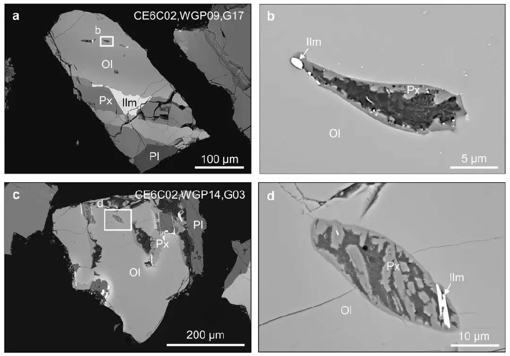 图2 嫦娥六号玄武岩中熔体包裹体的岩相特征.嫦娥六号玄武岩中的橄榄石极其稀少,仅发现两颗富含橄榄石的玄武岩,并发现了几十微米大的数颗熔体包裹体。Ol:橄榄石;Px:辉石;Ilm:钛铁矿;Pl:斜长石。