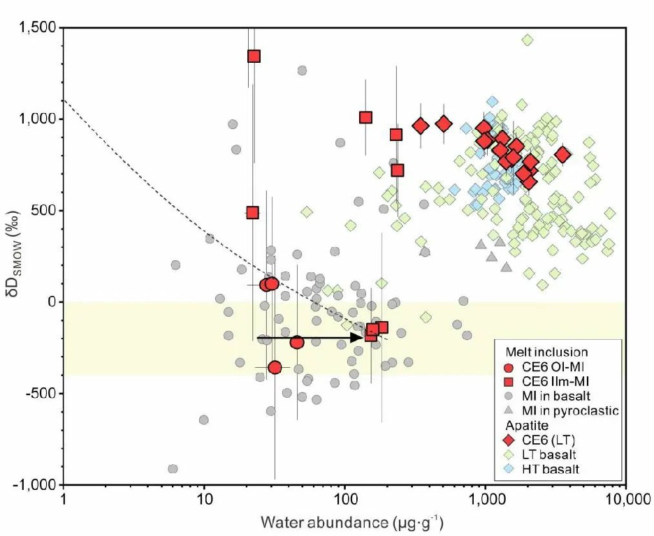 为了揭示SPA盆地下覆月幔的水含量,中国科学院地质与地球物理研究所博士后何会存、博士生李林曦、胡森研究员、林杨挺研究员与南京大学惠鹤九教授等人借助纳米离子探针(NanoSIMS)对嫦娥六号玄武岩样品中的熔体包裹体和磷灰石进行了水含量与氢同位素的分析(图2)。研究结果表明橄榄石熔体包裹体中的水含量小于50微克/克,且贫氘(δD~-200‰左右;图3);钛铁矿中的熔体包裹体中水含量以及氢同位素的变化范围较大;磷灰石的水含量可达3500微克/克,且非常富氘(δD~+826‰;图3)。根据橄榄石熔体包裹体、磷灰石与钛铁矿熔体包裹体的水含量与氢同位素测试数据,以及岩相和化学成分特征,可以恢复嫦娥六号玄武岩的岩浆演化过程(图4),并估算嫦娥六号玄武岩的母岩浆水含量约为15-22微克/克。