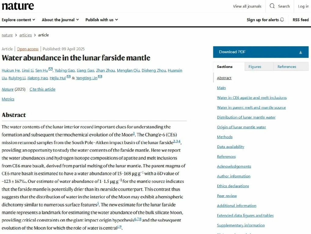 该研究成果2025年4月9日在线发表在国际权威学术期刊 Nature(何会存#,李林曦#,胡森*,高宇冰,高亮,周湛,邱梦凡,周迪圣,刘焕欣,李瑞瑛,郝佳龙,惠鹤九*,林杨挺*. Water abundance in the lunar farside mantle. Nature, 2025. DOI: 10.1038/s41586-025-08870-x)。