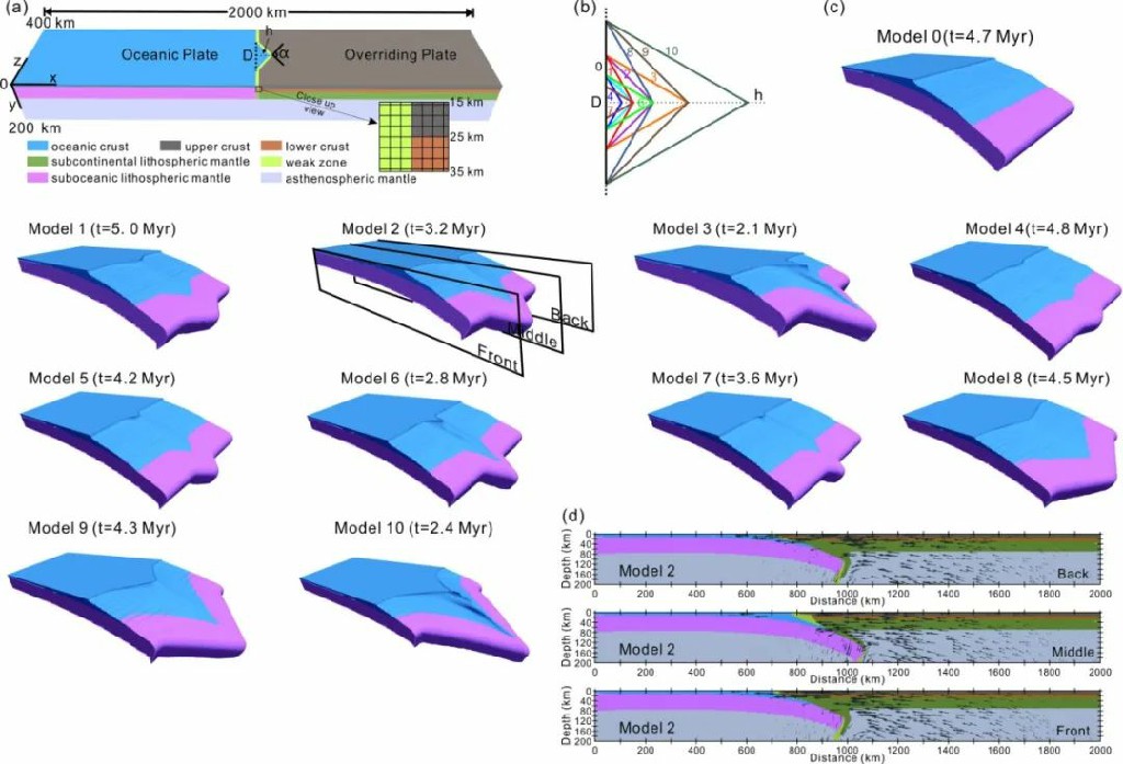 针对以上问题,中国科学院地质与地球物理研究所海陆油气综合地球物理团队董淼副研究员、郝天珧研究员等,通过多组三维地球动力学数值模拟试验,研究了角落结构对俯冲起始的影响,最终得出结论:在小型洋盆中,无论角的大小和角度如何,俯冲都是在角的顶点开始的。小角度的拐角会促进俯冲起始,但角度大于120°的拐角不利于俯冲起始,反而可能会阻碍俯冲起始的发生。