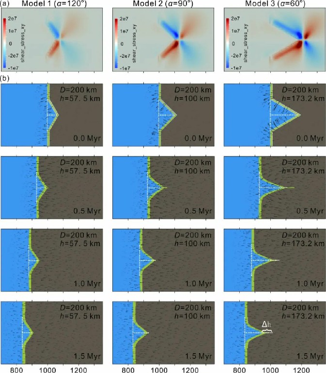 这是因为无论角度大小,边界角结构会将应力集中在顶点(图3a),这使得角的顶点比其他地方更容易发生形变。随着俯冲起始的开始,边界角的整体面积会逐渐变小。不同模型的减小程度不同(图3b)。小角度的边界角度,力在z方向上的分量足够大,使上覆板块发生形变,角落的顶点位置逐渐闭合。因此位于顶点处的大洋板块能很快下沉到软流圈中,并促进俯冲起始的发生。由于这种小角度角的几何结构的不稳定性,因此很难在地球表面很难存在很大范围的锐角的角落结构。