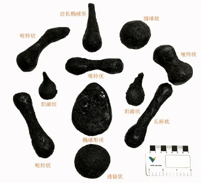 雷公墨是地球上分布范围最广,形态最为丰富的一类玻璃陨石,基本涵盖了所有玻璃陨石的形态特征。保存完整的雷公墨从外形上主要可以分为六种:哑铃状,呈中间细两端膨大的棒状或纺锤状;泪滴状,好像拉长的泪滴或从水龙头滴下的水滴;长棒状,一般长度在3厘米~5厘米,截面圆形,截面直径一般小于1厘米;拉长椭球形,往往一端较大,一端较小,长轴大于短轴的2倍以上,长轴横截面为圆形;椭圆或近圆球状,长轴和短轴近似相等;透镜状或薄饼状,中间厚边缘变薄。此外还有瓦片状、纽扣状、独木舟状、果核状、椭球形状和不规则状等原始形态。此外,破碎或异地埋藏的雷公墨具有层状、碎胡桃壳状、薄片状等形态,断面可见玻璃状断口,可能是经历了磨蚀、冲蚀等风化作用后碎裂的结果。