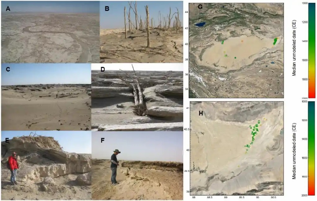 针对以上问题,中国科学院地质与地球物理研究所新生代地质与环境实验室罗布泊研究团队的李康康博士、秦小光研究员、许冰研究员、顾兆炎研究员和刘嘉麒院士等,联合国内外多位研究人员,在全面调查罗布泊无人区古河网、古植被的基础上(图1A-图1F),系统测定了罗布泊原位古林地的碳十四年代(图1G-图1H),进一步整合塔里木河流域已发表的古植被年代与现代林地的树轮年代学结果,建立了独立、年代可靠、高时空分辨率的过去千年塔里木盆地水文变化记录。