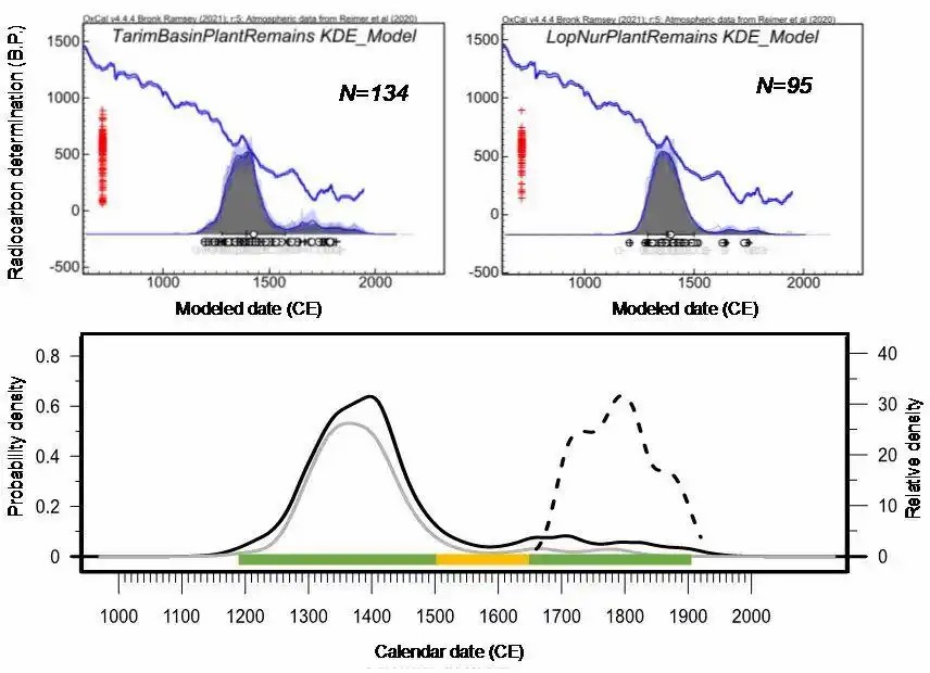 图2 塔里木盆地林地年代。左上:盆地范围内古植被碳十四年代;右上:罗布泊地区古林地碳十四年代;下:重建的过去千年水文变化记录。绿色条带代表丰水期,黄色条带代表枯水期,实线为古林地的碳十四年龄分布,虚线为现代林地的树轮年代分布