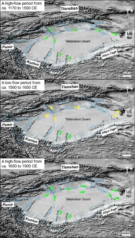 研究发现,过去千年流域水文变化具有百年尺度波动特点,即丰水期(~1170-1500 CE)-枯水期(~1500-1650 CE)-丰水期(~1650-1900)模式(图2),表明以往认为塔里木盆地最近千年连续湿润的观点是不准确的。